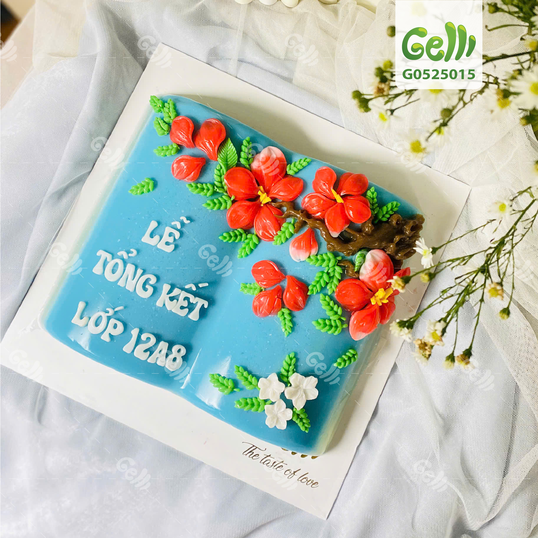 Chiếc Bánh sinh nhật rau câu 4D được tạo hình như một trang sách mở, nơi những dòng kỷ niệm tuổi học trò còn in đậm. Trên nền rau câu trong veo, nổi bật đóa phượng đỏ rực cháy, như lời chào của mùa hè, như tiếng trống tổng kết ngân vang khép lại một chặng đường.