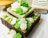 Bánh được tạo hình 2 tầng vuông vững chãi, điểm xuyết hoa xanh và hoa trắng mềm mại. Sự kết hợp hài hòa mang đến cảm giác tinh khôi, thanh mát, tượng trưng cho tình yêu bền lâu và hạnh phúc viên mãn.
