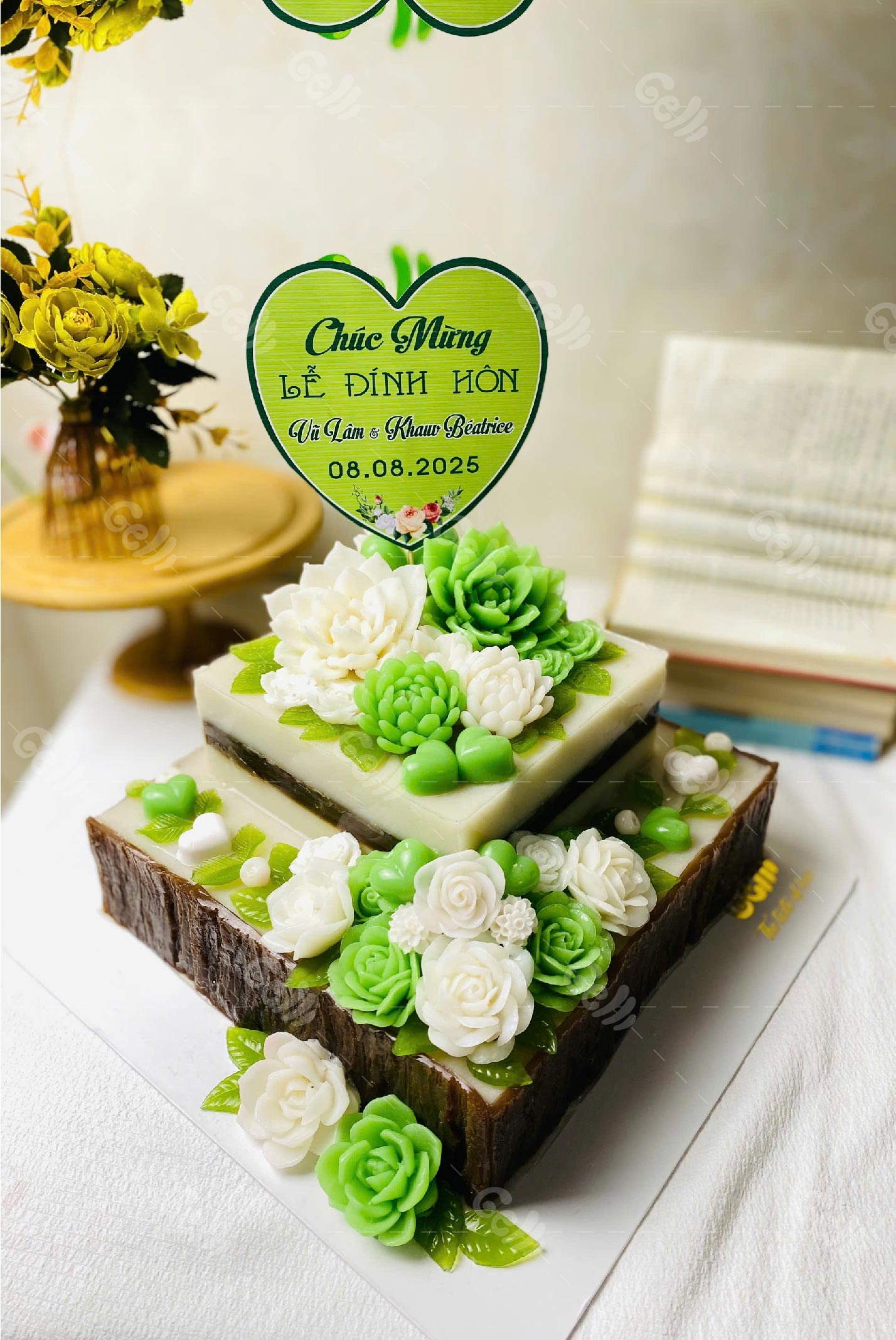 Với bánh sinh nhật rau câu 2 tầng hoa xanh trắng cho đính hôn, Gelli gửi trao không chỉ là một chiếc bánh, mà còn là lời chúc hạnh phúc, viên mãn cho đôi uyên ương trong ngày trọng đại.