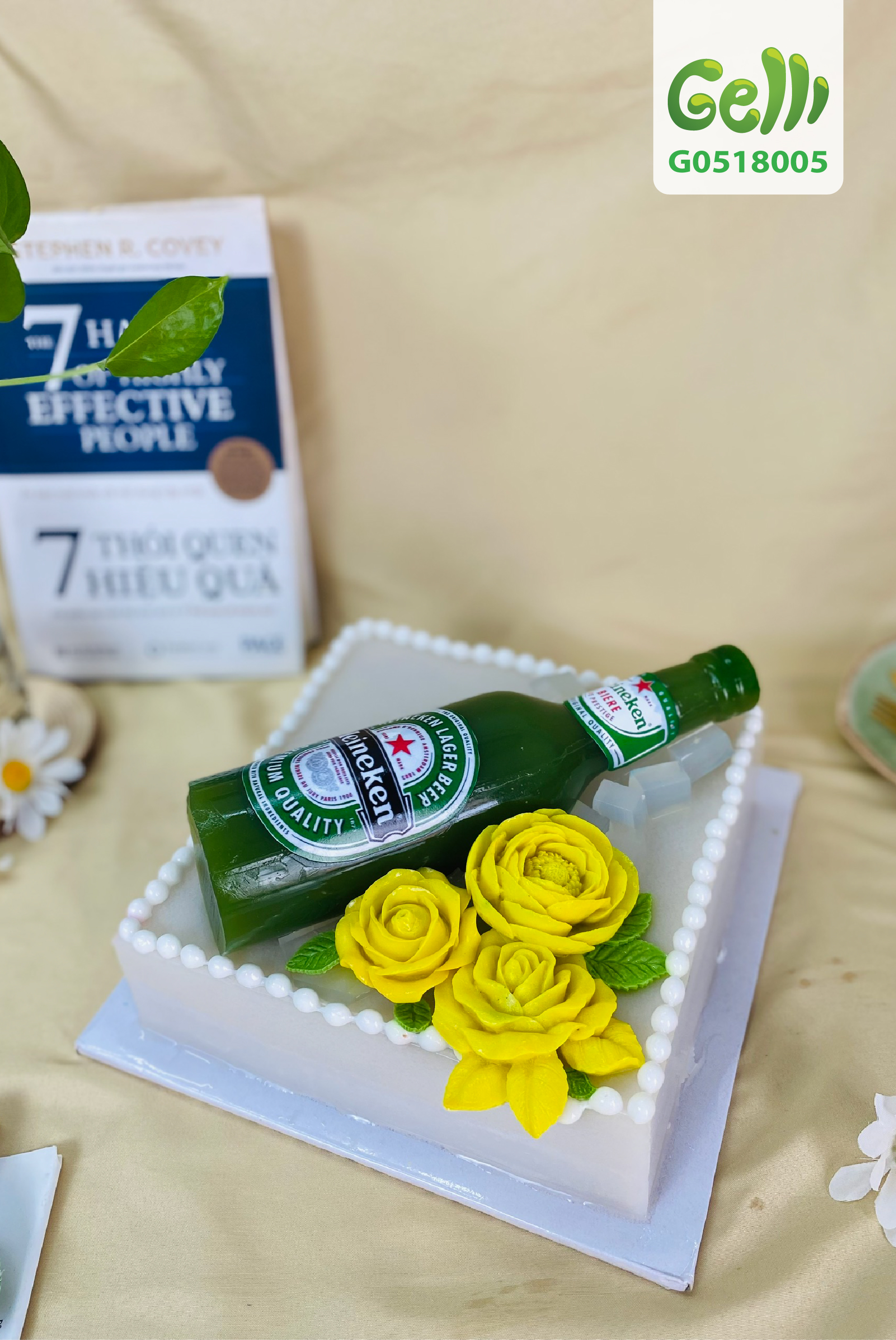 Gelli cho ra đời những mẫu Bánh Sinh Nhật Rau Câu Trái Cây hình chai bia Heniken & hoa hồng vàng tượng trưng cho sự thấu hiểu mà bạn đối với những sở thích, thói quen hằng ngày của chàng, cũng như sự chung thủy, sắt son trong tình yêu mà bạn trao trọn cho người yêu.