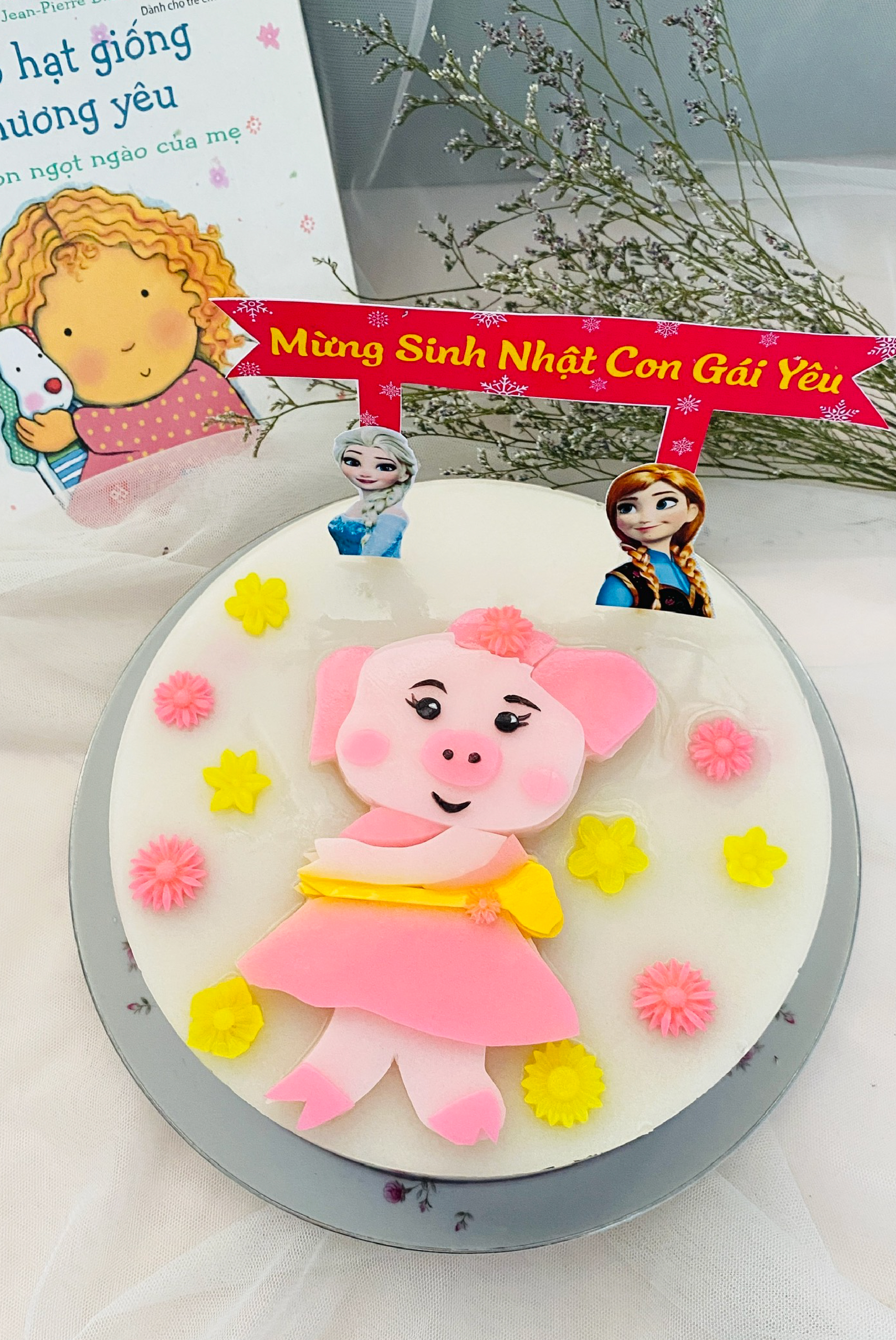Giải pháp cho bé thích một chiếc bánh có Elsa, có con heo theo tuổi của bé chính là chiếc bánh sinh nhật rau câu hình con heo cùng cây cắm Elsa và Ana phía sau.