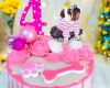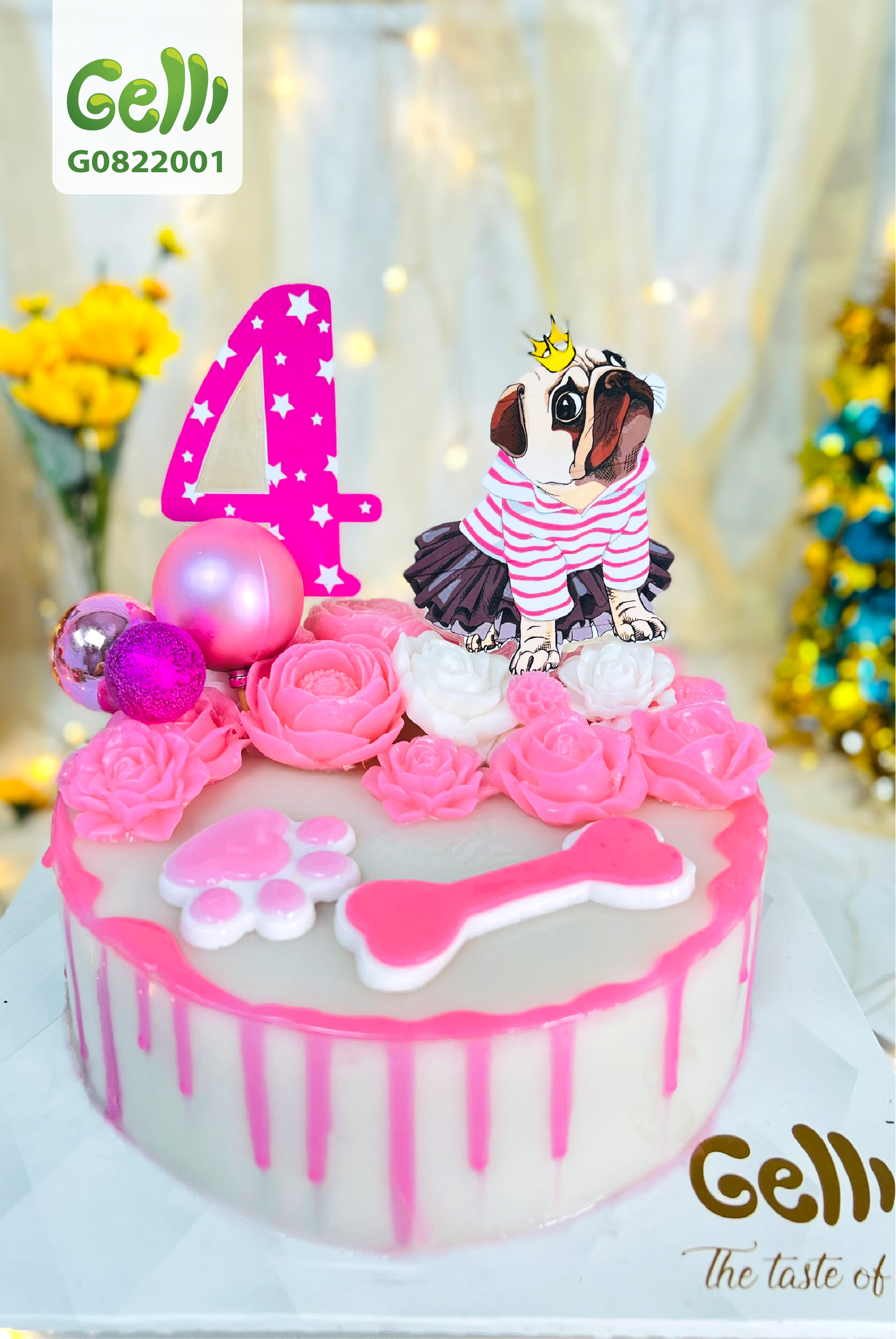 Một chiếc bánh có em bé cún mặt ngầu mặc set váy xinh xắn, đội vương miện, những bông hoa hồng xinh đẹp, số tuổi của bé và những quả bóng kim tuyến có thể làm đồ chơi nữa.