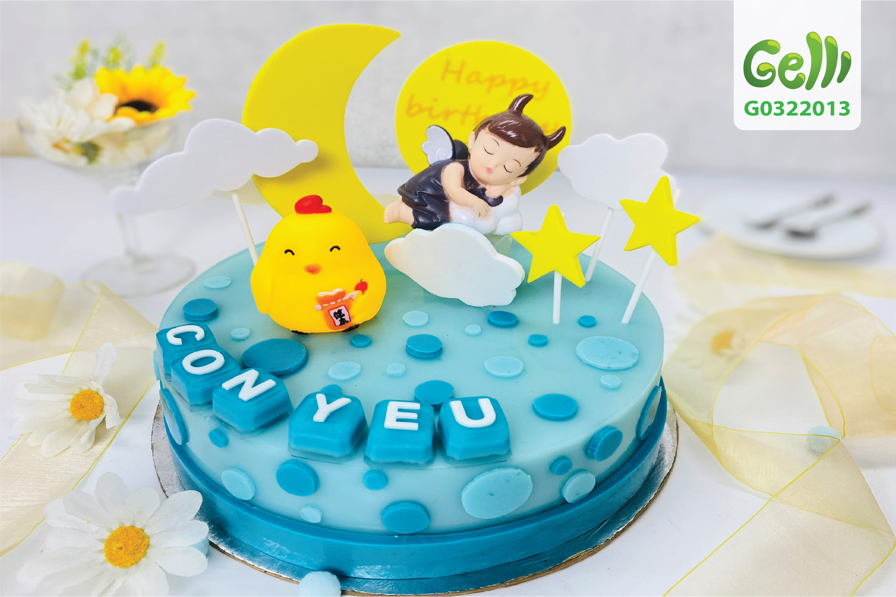 Toàn thể chiếc bánh sinh nhật rau câu là bầu trời có trăng, sao, mây và có cả thiên thần bé nhỏ cùng em bé gà màu vàng đối với bé trai, bé gà màu hồng đối với bé gái .