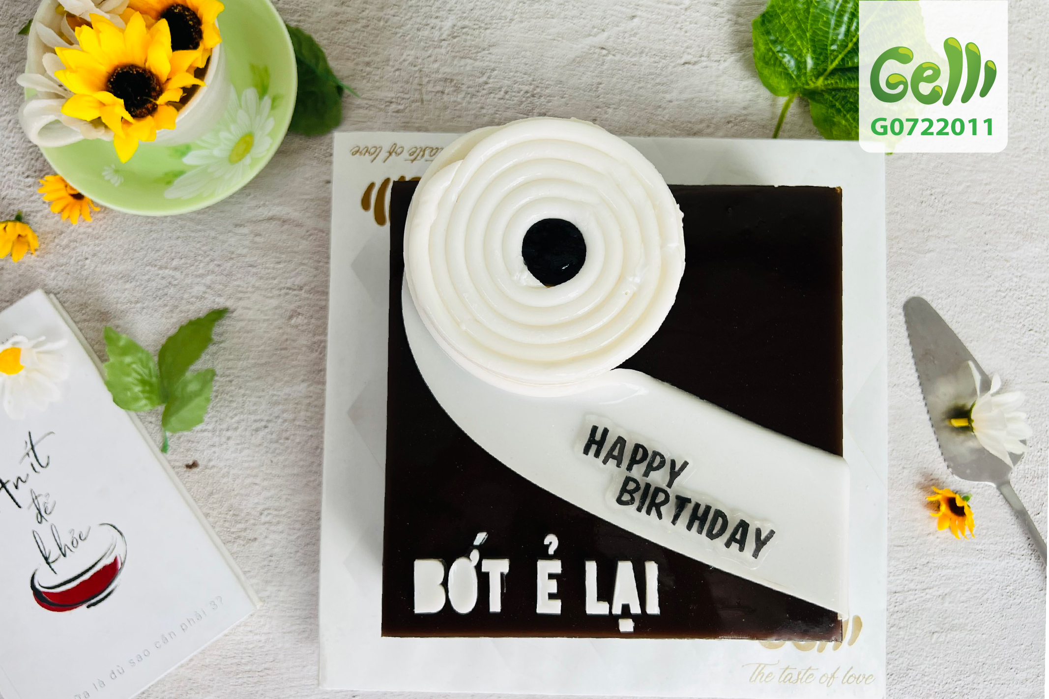 Bánh được trang trí hình cuộn giấy vệ sinh đang được kéo ra trải dài trên mặt bánh màu nâu cùng dòng chữ: " BỚT Ẻ LẠI ". Bữa tiệc sinh nhật sẽ không thiếu những tiếng cười, những lời tán gẫu và thêm cả những câu chuyện khôi hài xoay quanh chủ đề muôn thuở này.