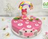 Bánh được trang trí trên nền hồng xinh xắn, bên trên mặt bánh là những bông hoa nhỏ tươi tắn. Đặc biệt, ở chính giữa bánh là cô bé búp bê đang ngồi trong dáng điệu rất cool và hai nàng công chúa Elsa và Anna đứng hai bên búp bê với cây Happy birthday. Bên dưới thân bánh là hình chú mèo đáng yêu và tên của bé.