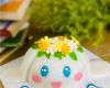 Toàn thể chiếc bánh sinh nhật rau câu Cinnamoroll được trang trí gương mặt của bé cún bởi một màu trắng, điểm nhấn là vòng hoa màu trắng, vàng nhạt và vàng cam kết hợp cùng nhau trên đầu chú cún rất dễ thương, gương mặt của chú thật đáng yêu với đôi mắt long lanh màu xanh dương, hai má ửng hồng và khuôn miệng chúm chím.