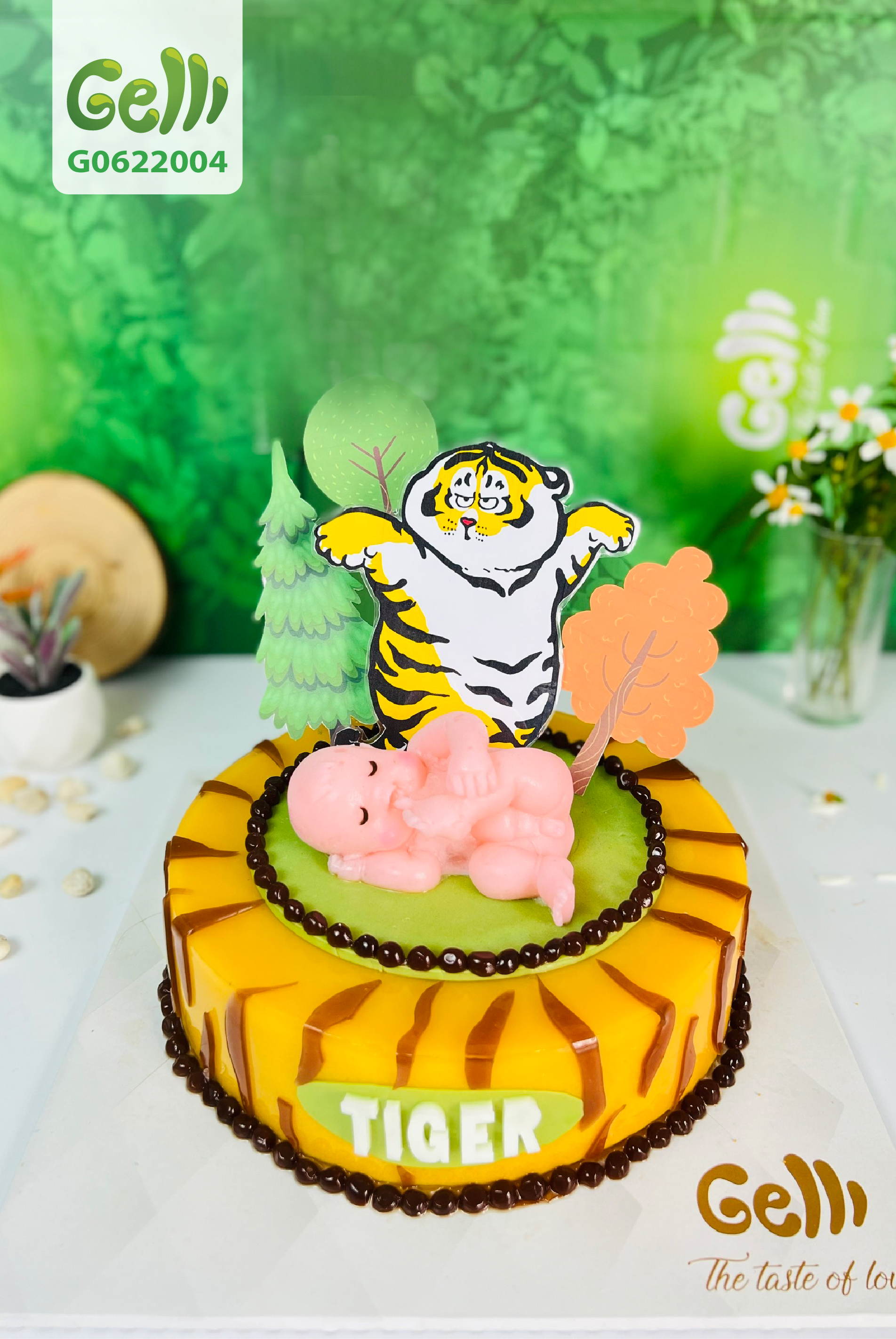 Một chiếc bánh với nền màu vàng cam như màu lông của chúa tể sơn lâm đầy vằn vện, hình ảnh chú hổ được cắm trên bánh và em bé vô tư nằm mút chân đầy đáng yêu.