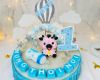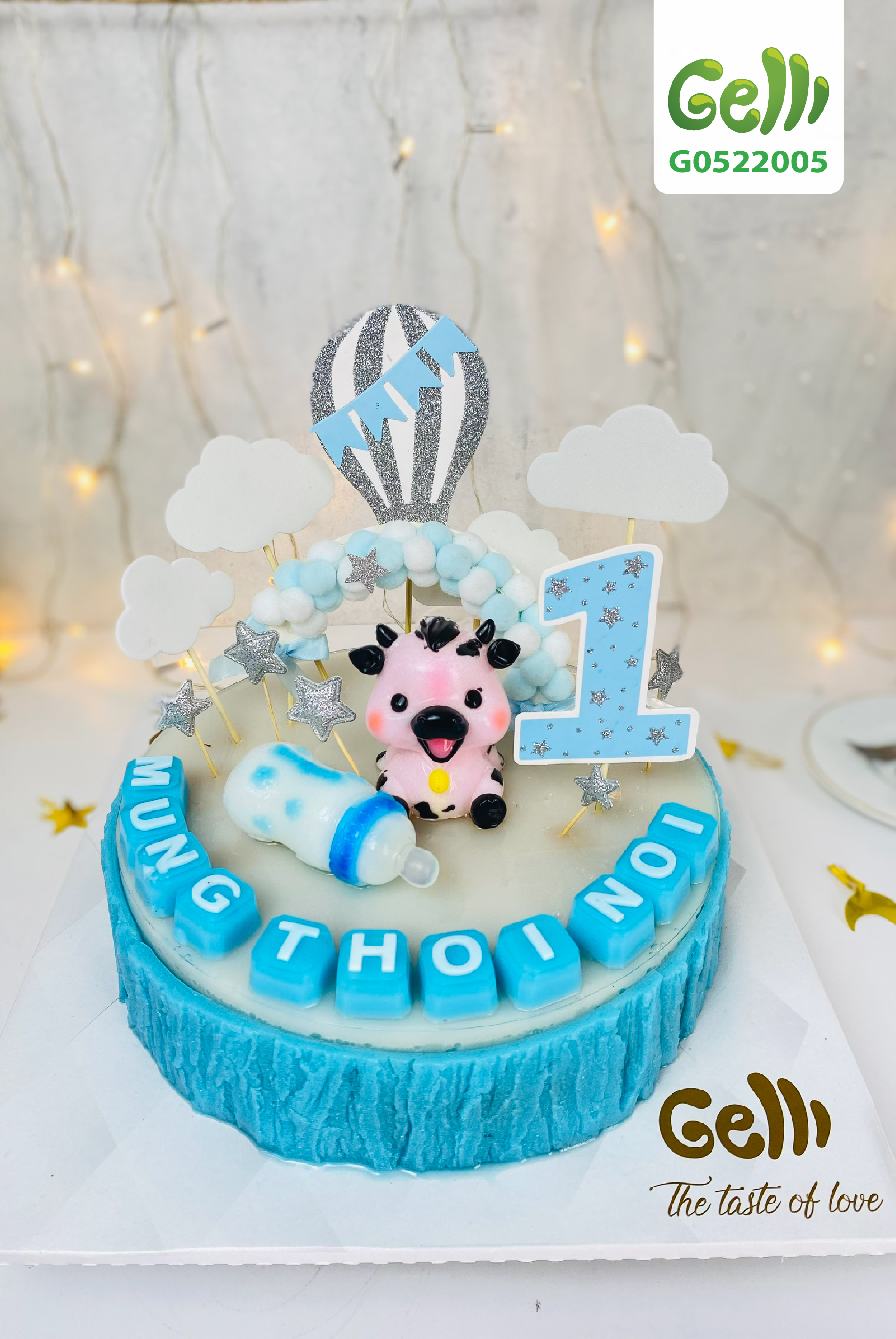 Bánh được ốp xung quanh là màu xanh vân gỗ lạ mắt, trên nền trắng của bánh có một chú trâu xinh xắn và chiếc bình sữa nằm bên cạnh, đặc biệt là số 1 thật nổi bật đánh dấu tháng tuổi hoặc năm tuổi vừa tròn của con. Điểm nhấn đáng yêu không kém là một cây cắm bong bóng và khinh khí cầu, những đám mây trắng vui nhộn.