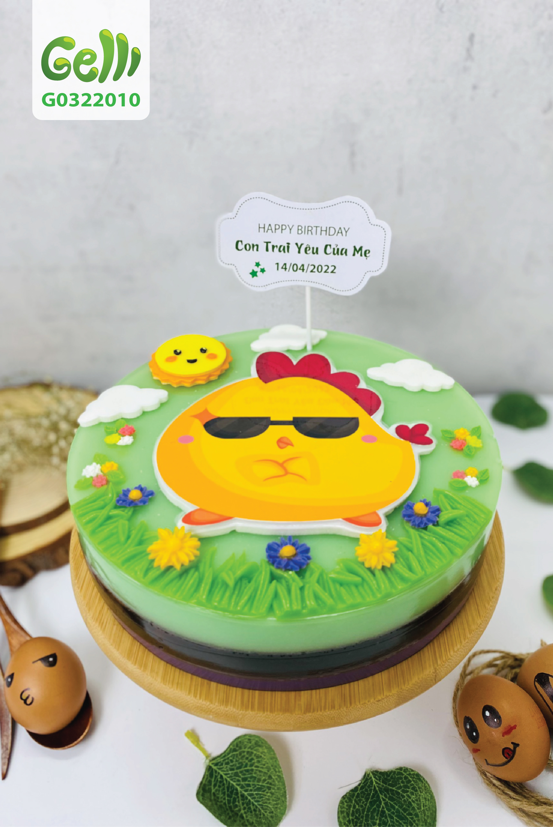 Toàn thể chiếc bánh sinh nhật rau câu là một khu vườn đầy hoa, cỏ, ông mặt trời trên cao đang vui vẻ nhìn xuống bạn gà đeo mắt kính đen siêu cute, mặt ngầu đầy ngộ nghĩnh.