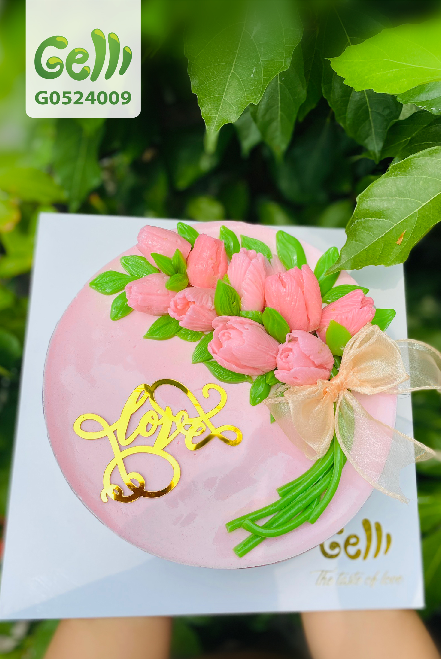 Một chiếc bánh mang nét đẹp của sự sống từ những loài hoa có thể làm món quà tặng tinh tế cho những nàng yêu thích hoa trong những dịp trọng đại chính là Bánh sinh nhật rau câu hoa nhành hoa tulip hồng này.