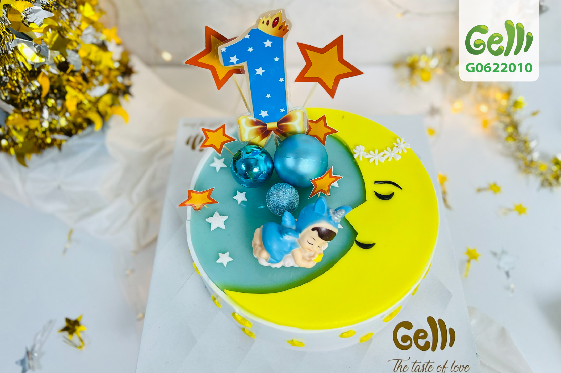 Bánh sinh nhật rau câu thiên thần ngủ trên cung trăng với tông màu xanh kết hợp vàng có thể dành cho ngày đầy tháng - thôi nôi cả bé trai lẫn bé gái.