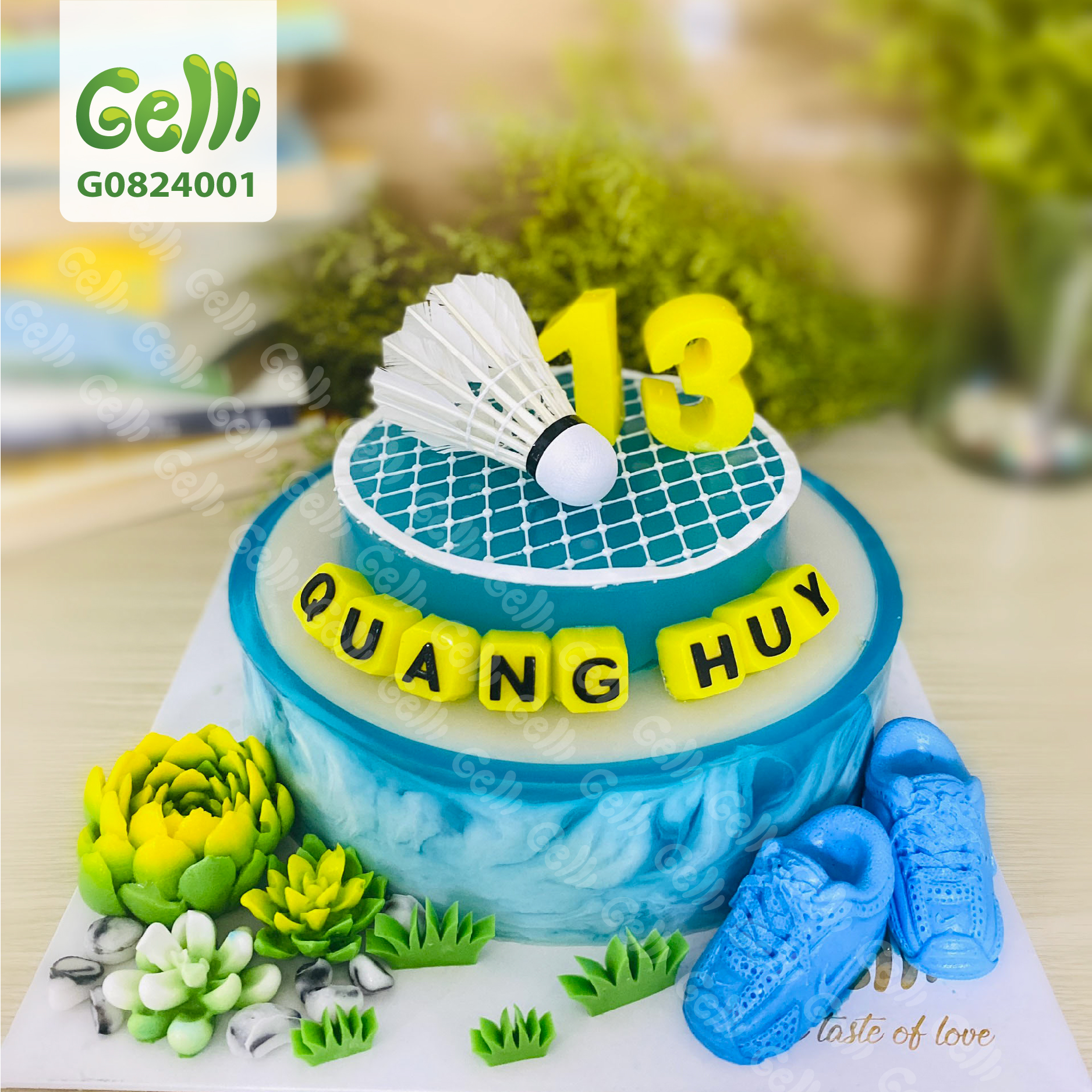 Trang trí: Chiếc bánh sinh nhật trang trí mặt bánh như 1 chiếc vợt cầu lông, quả cầu lông đc đặt lên trên và số tuổi của con được dựng đứng nổi bật. Thân bánh có màu ombre xanh dương và trắng rất đẹp mắt và tinh tế. Tên của bé được viết trên các viên chữ to màu vàng ấn tượng. Dưới đế là một đôi giày thể thao màu xanh và những đoá sen đá tươi tắn làm nên sự hài hoà cho chiếc bánh.