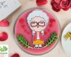 Bánh sinh nhật rau câu trang trí hình ảnh người bà mặc chiếc váy màu vàng, áo khoác len mỏng nhẹ màu hồng, chân mang giày búp bê, mái tóc bạc phơ được cắt tém gọn gàng, gương mặt đeo mắt kiếng tròng vuông ngộ nghĩnh và tay thì bắn tim nhí nhố.