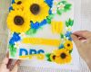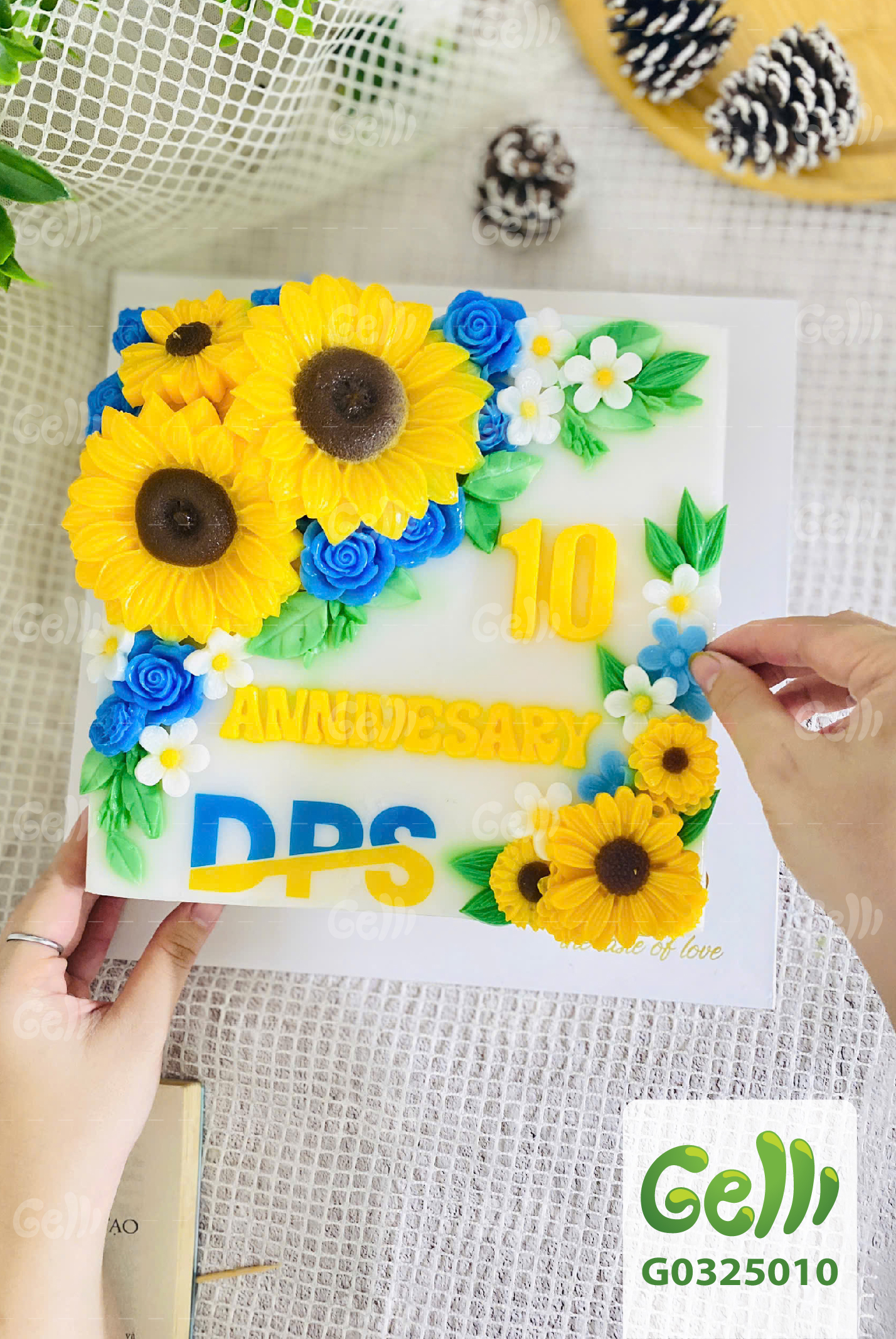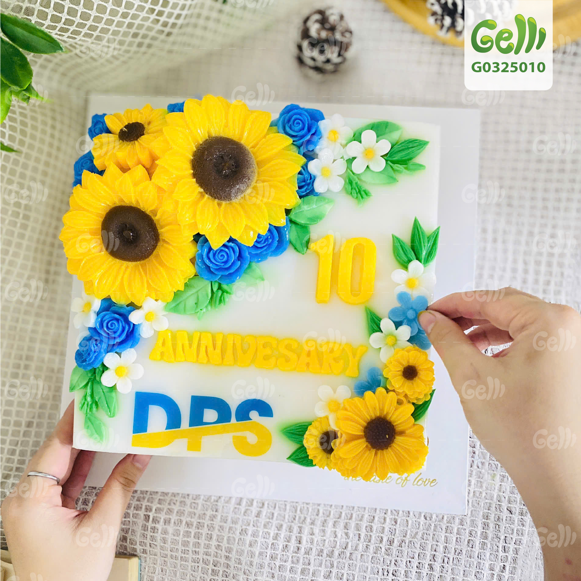 Bánh có nền màu trắng, các bông hoa hướng dương màu vàng nhuỵ nâu, một vài bông hoa nhỏ màu xanh dương đậm chính là tone màu chủ đạo của công ty, logo công ty được trang trí sắc nét , cùng dòng chữ Anniversary và số 10 nổi bật, Kỷ niệm 10 năm thành lập.