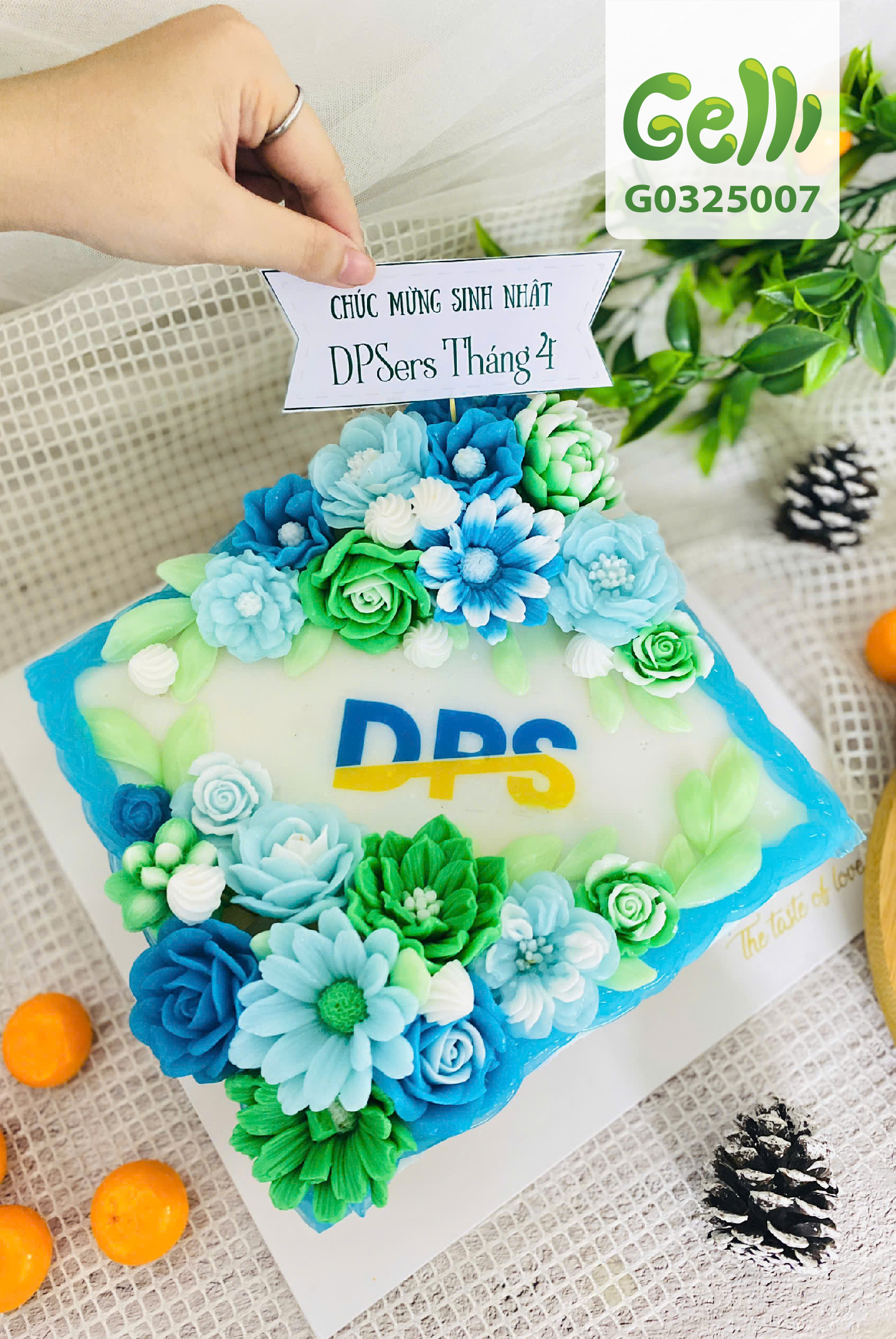 Bánh có nền màu trắng của cốt dừa, logo của công ty, các bông hoa trắng, xanh đậm và nhạt kết hợp tinh tế .