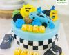 Bánh được trang trí hình chiếc siêu xe bằng rau câu màu xanh siêu ấn tượng...xung quanh là những chi tiết bánh xe, khúc gỗ, mặt trời rạng rỡ. Đặc biệt, tên bé được khắc hoạ màu vàng nổi bật trên mặt bánh . Thân bánh ốp hoạ tiết caro trắng đen rất nam tính. Thêm những chiếc hotwheel màu đen dưới đế bánh như cùng gửi lời chúc mừng sinh nhật bé .