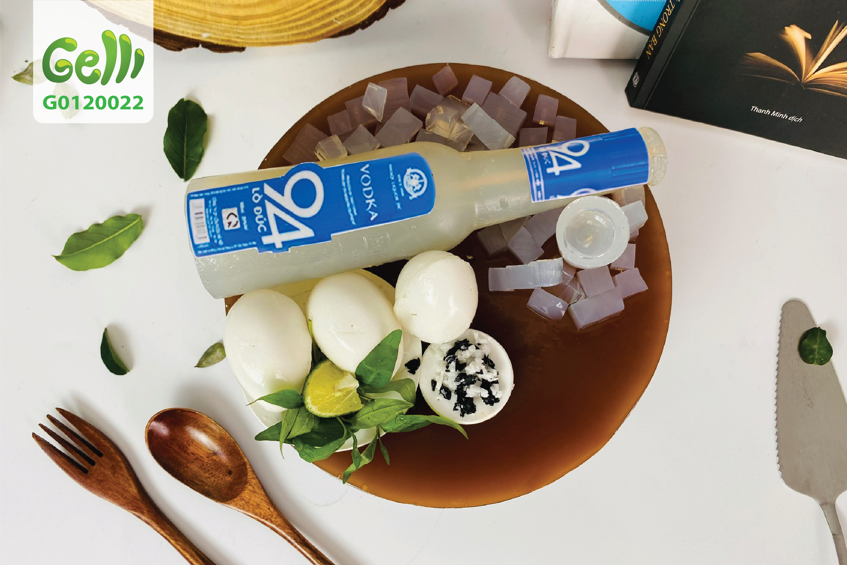 Bánh kem rau câu 4D chai rượu vodka & trứng lộn muối tiêu chanh được cấu tạo bởi 3 lớp bánh với 3 hương vị khác nhau: Cafe - cốt dừa - lá dứa. Nhân bánh có flan + dừa tươi được cắt nhỏ.