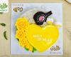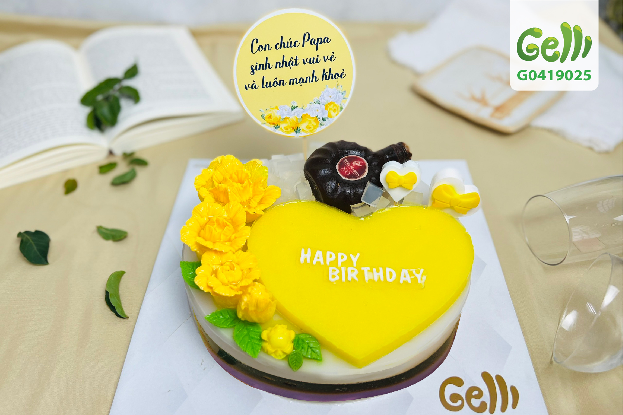 Bánh được trang trí chai rượu XO màu nâu & trái tim màu vàng trên nền bánh trắng đẹp mắt. Mang nét cá tính, độc đáo, lại lãng mạn, ngọt ngào, chiếc bánh sinh nhật rau câu này vừa làm đẹp lòng người nhận mà còn ưng bụng người trao.