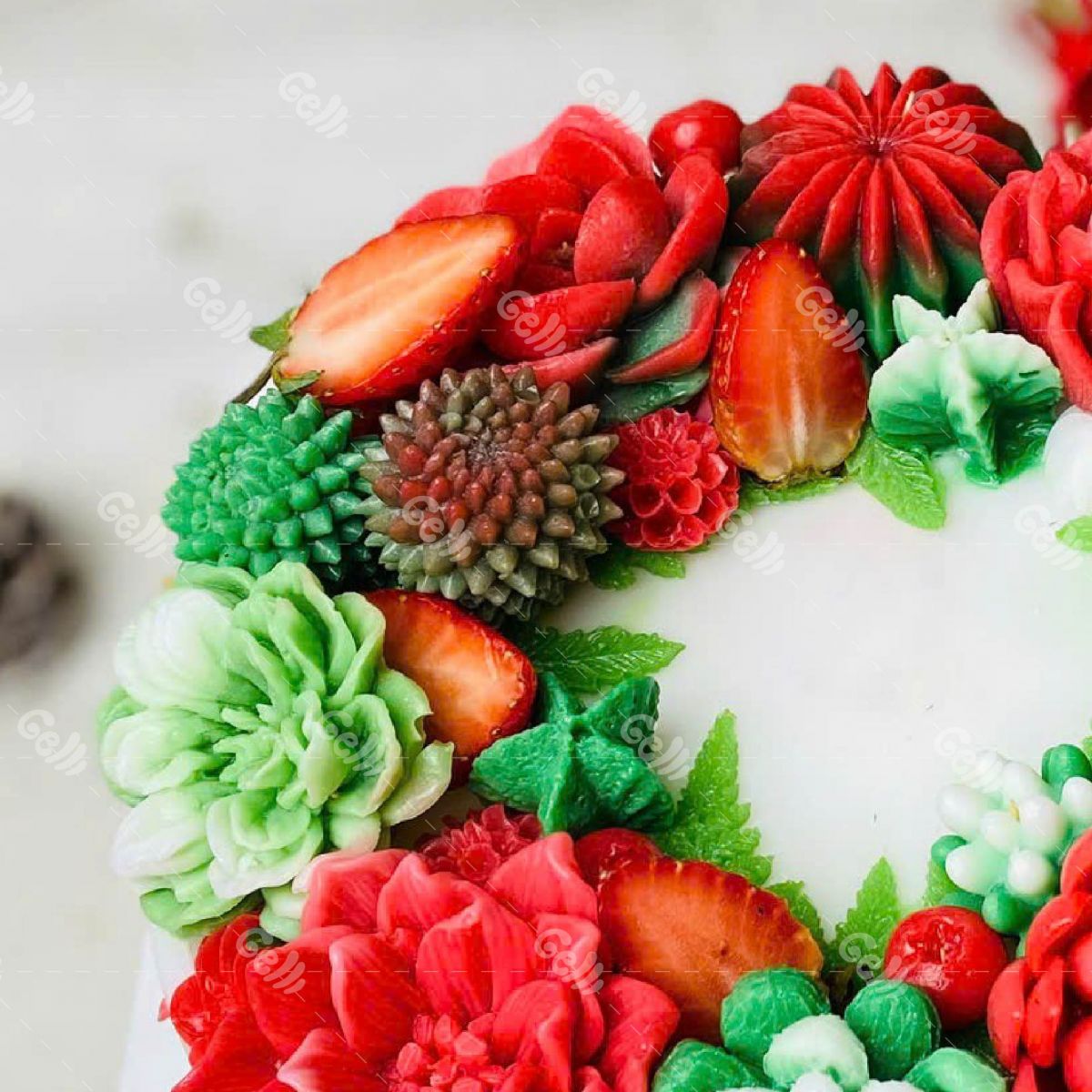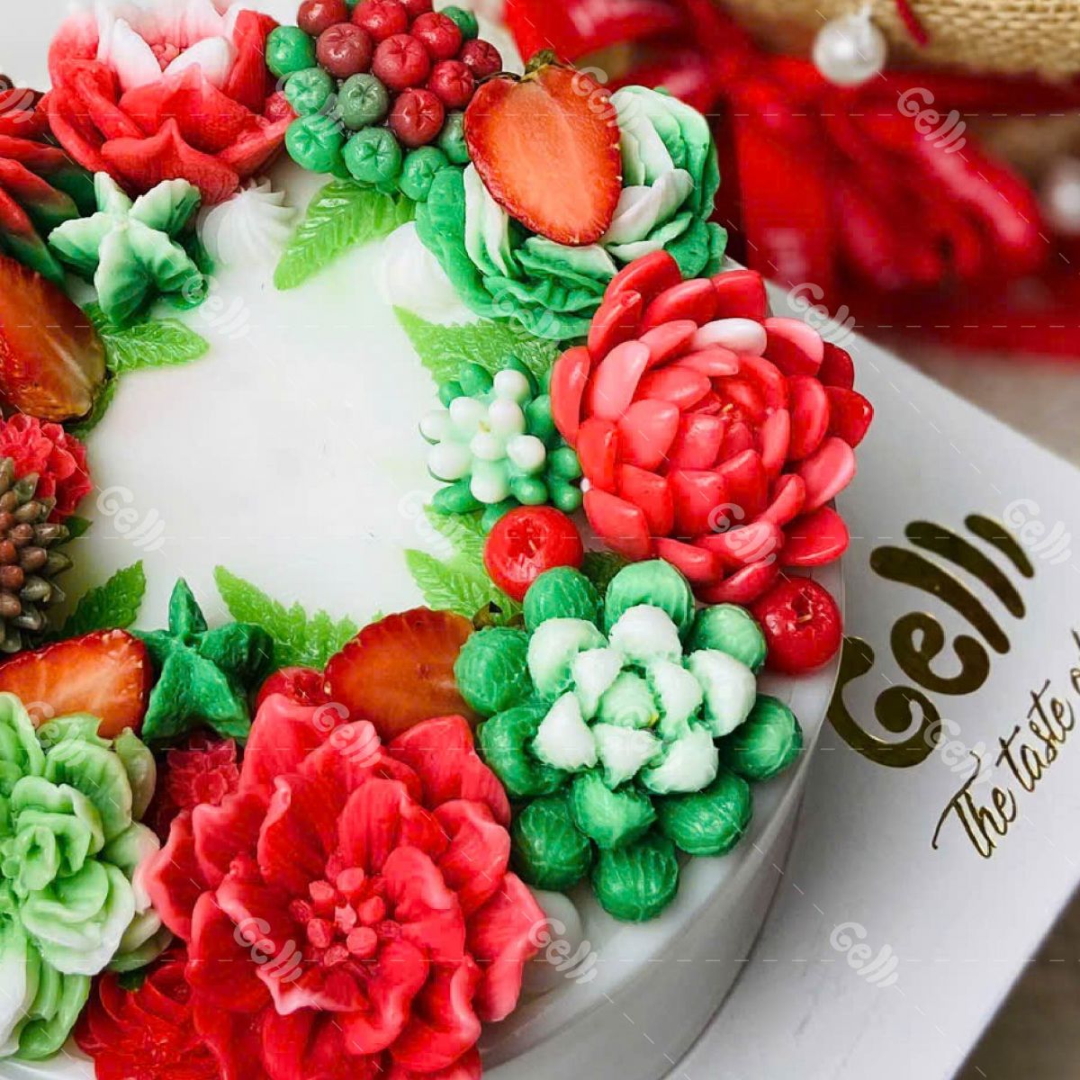 Từng bông hoa đỏ – trắng – xanh được tạo hình thủ công với độ tinh xảo cao. Xen lẫn là dâu tươi, lá rau câu và những cụm trái trang trí khiến chiếc bánh giống như một vòng hoa trang trí Noel thật sự, rực rỡ và nổi bật ngay từ ánh nhìn đầu tiên.