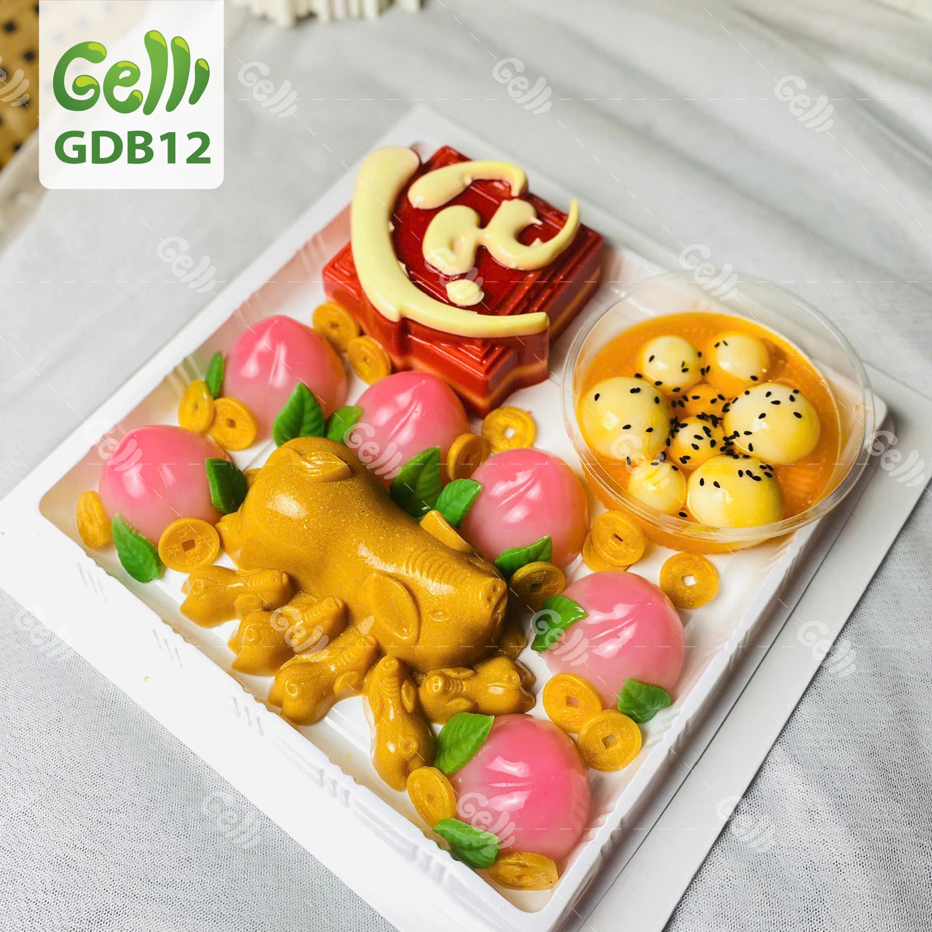 Set bánh rau câu cúng Đào Phúc Tài Lộc Gelli GDB12 gồm Heo vàng, Đào tiên, Bánh chữ Lộc, Bánh trôi nước và Tiền xu. Món bánh ý nghĩa cho mâm cúng, mang lại may mắn, tài lộc và sung túc cho gia chủ.