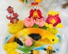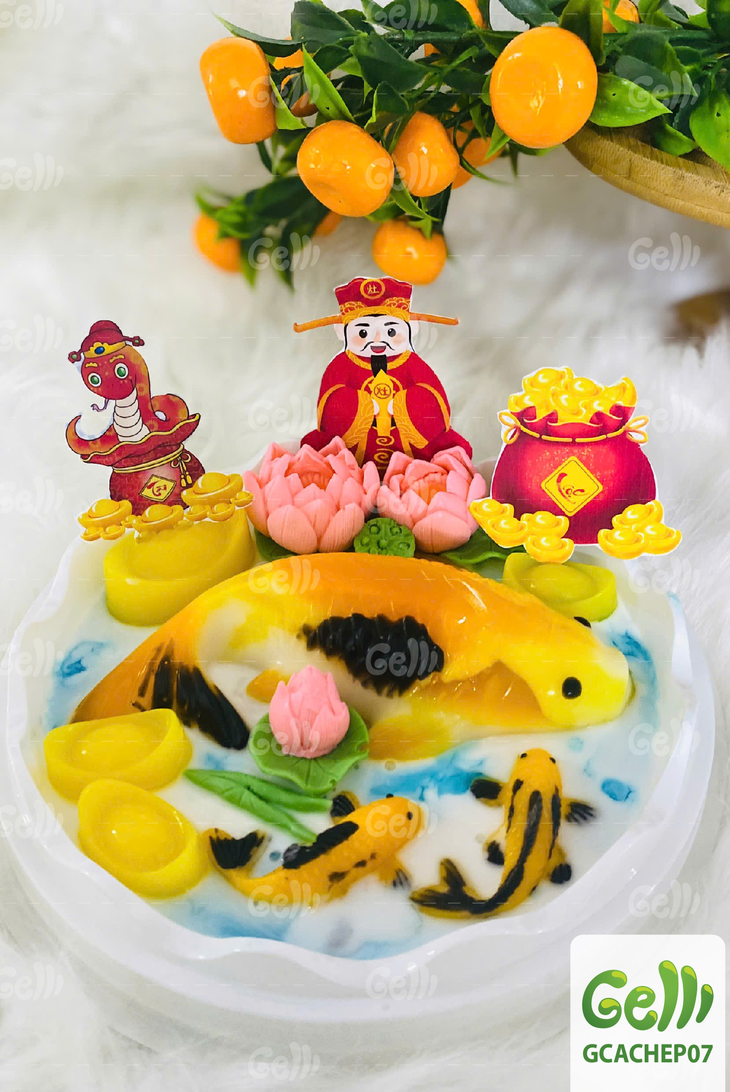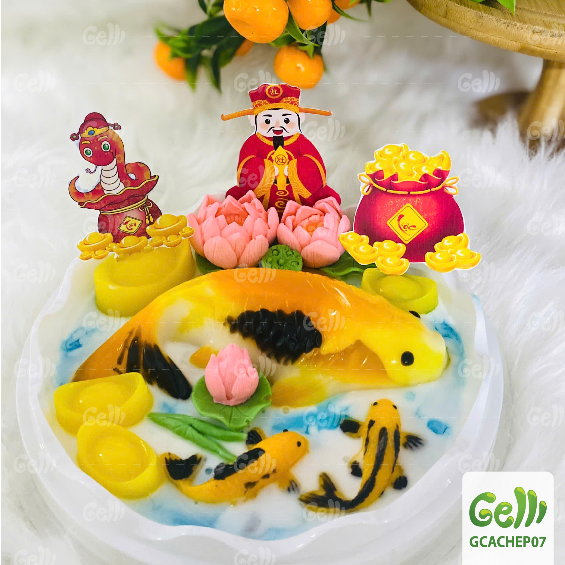 Bánh trang trí như một hồ sen với con cá chép lớn và 2 con cá nhỏ hơn được đổ rau câu tỉ mỉ, khéo léo với thân hình nhiều màu sắc tinh xảo, các thỏi vàng được xếp hài hòa cùng set cắm thần tài, túi vàng thể hiện sự đủ đầy, sung túc.