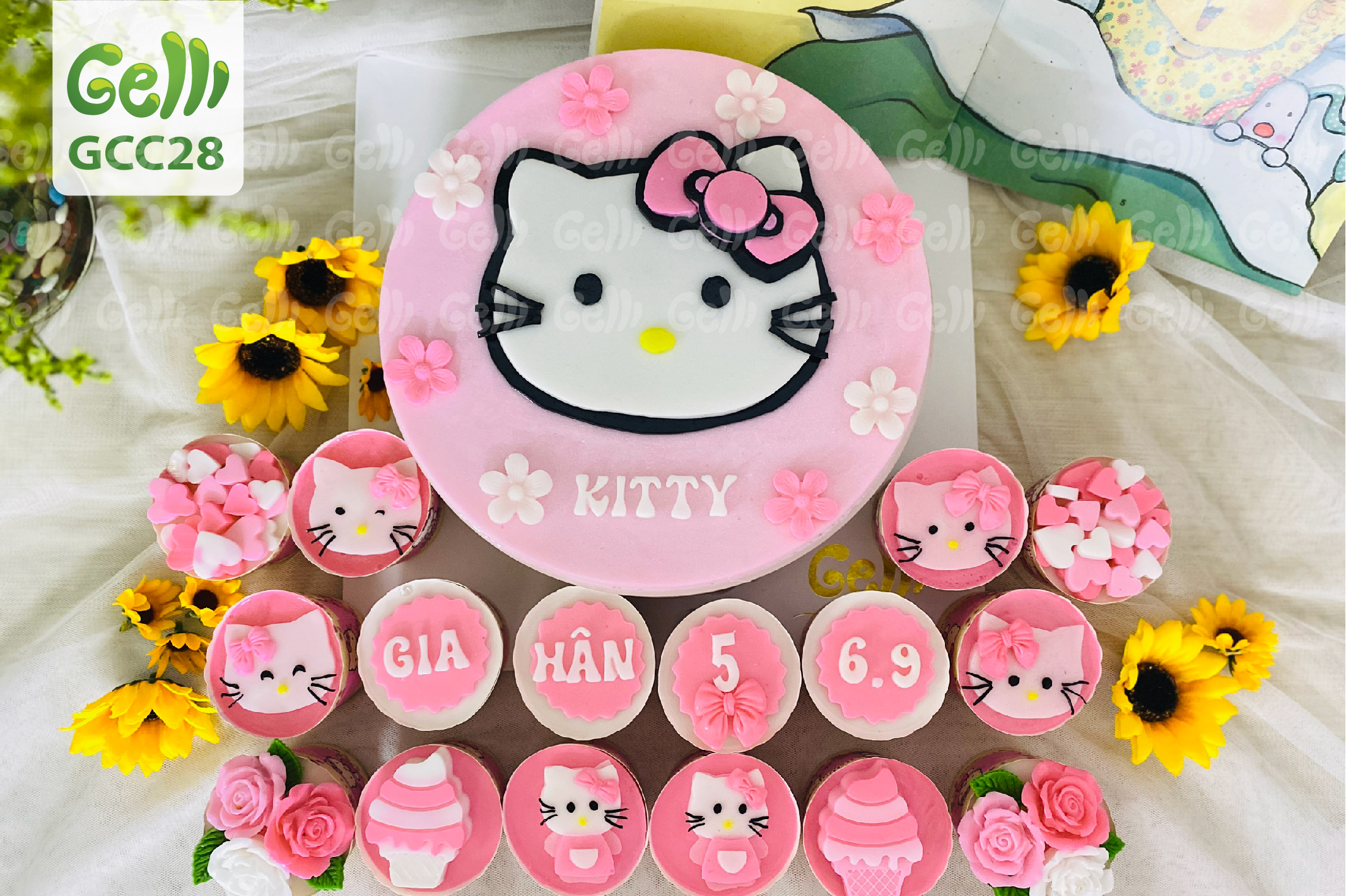 Bánh trang trí chủ đề mèo kitty với các họa tiết khác nhau như: bé mèo Hello kitty , các que kem, trái tim, hoa hồng cùng tên của con - số tuổi và ngày sinh được khắc trên bánh nổi bật.